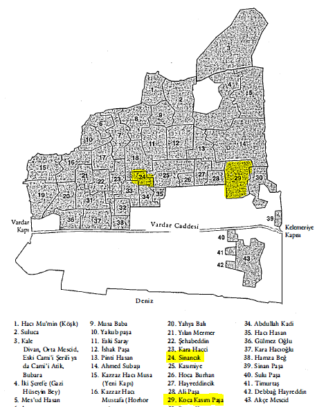 ❝Selanik’te Karakaş ve Kapancı üyelerin yaşadığı diğer mahalleler, Balat, Katip Muslihiddin, Kasımiye, Sinancık, Hacı İsmail, Hacı Hasan ve Osman Baba’nın evinin ve (daha sonra) türbesinin bulunduğu Kadı Abdullah mahalleleriydi. Baer’in de gösterdiği gibi, 20. yüzyılın başında her mezhepten zengin Dönmeler ile bazı “özgürleşmiş” Dönmeler, kent surlarının dışında yer alan, yeni kurulmuş, zengin Hamidiye mahallesine taşındı. Akyalçın’a göre, bazı zengin Dönmelerin eski mahallelerinde kalmaya devam etmesinin nedeni, geleneksel yapılarını muhafaza etmek istemeleriydi.❞23